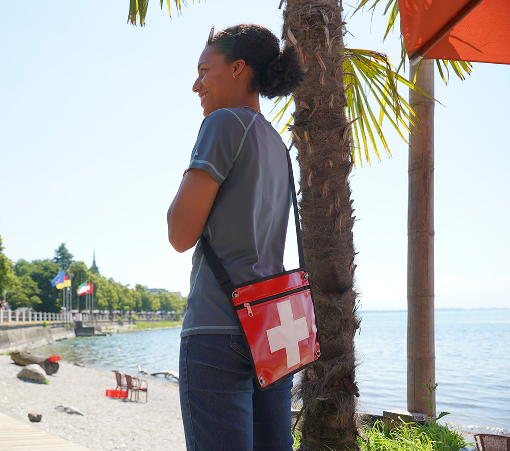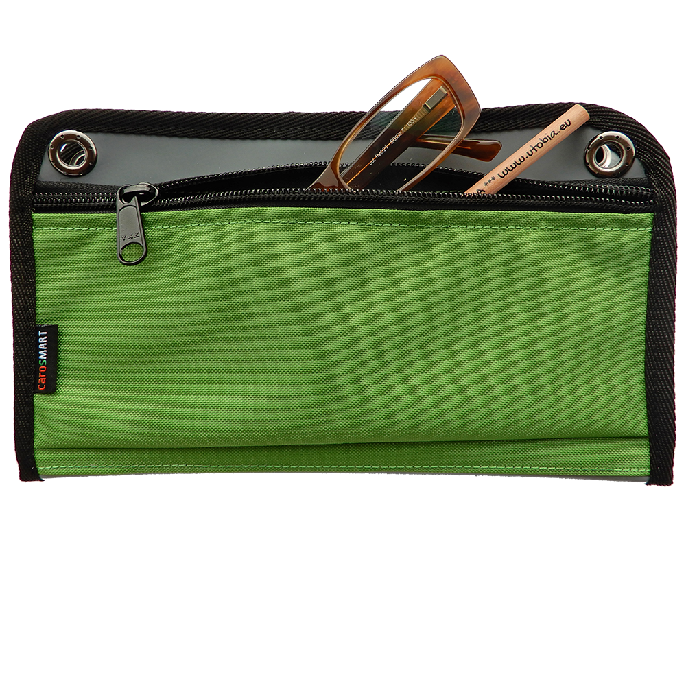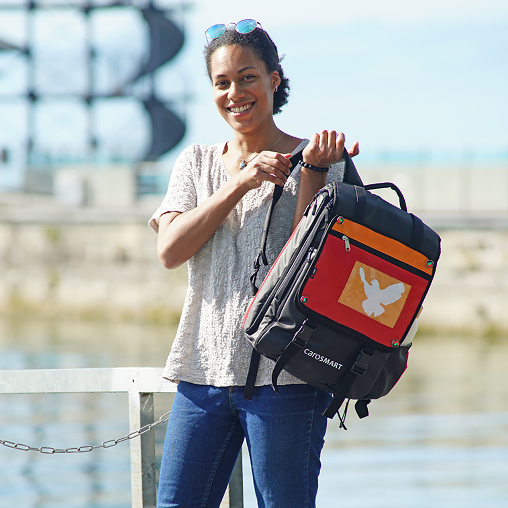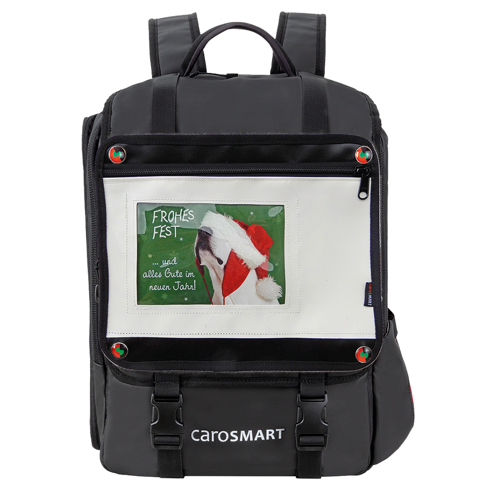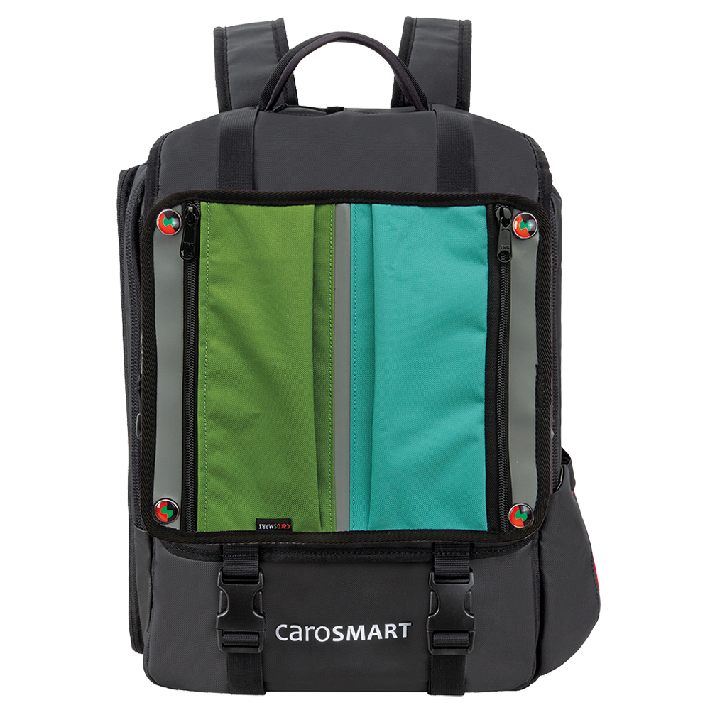 Alle Decobags passen auf den Carosmart Rucksackdeckel und können dort mit den Manschettenknöpfen fixiert oder als separate kleine Umhängetasche getragen werden. Hierzu wird die Decobag einfach mit den Manschettenknöpfen an dem mitgelieferten Schultergurt befestigt.