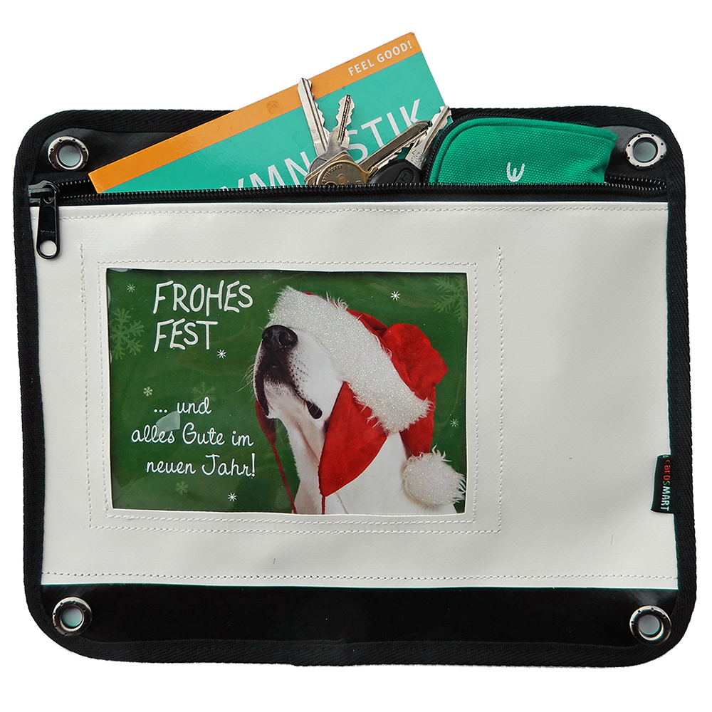 Besonderheit: im separaten Klarsichtfach kann in Postkartengröße ein eigenes Bild, das Firmenlogo oder eine Glückwunschkarte eingeschoben werden.